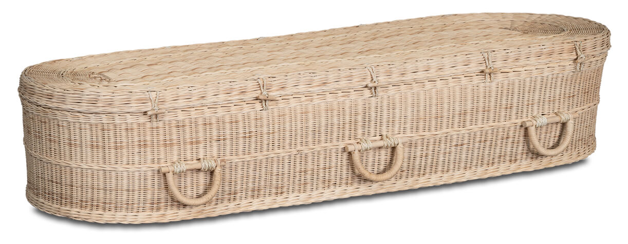 Een gevlochten rotan mand is een mooi alternatief voor de gangbare uitvaartkisten. Deze mand heeft een natuurlijke uitstraling en is biologisch afbreekbaar. Het interieur is van katoen met bijpassende wade.